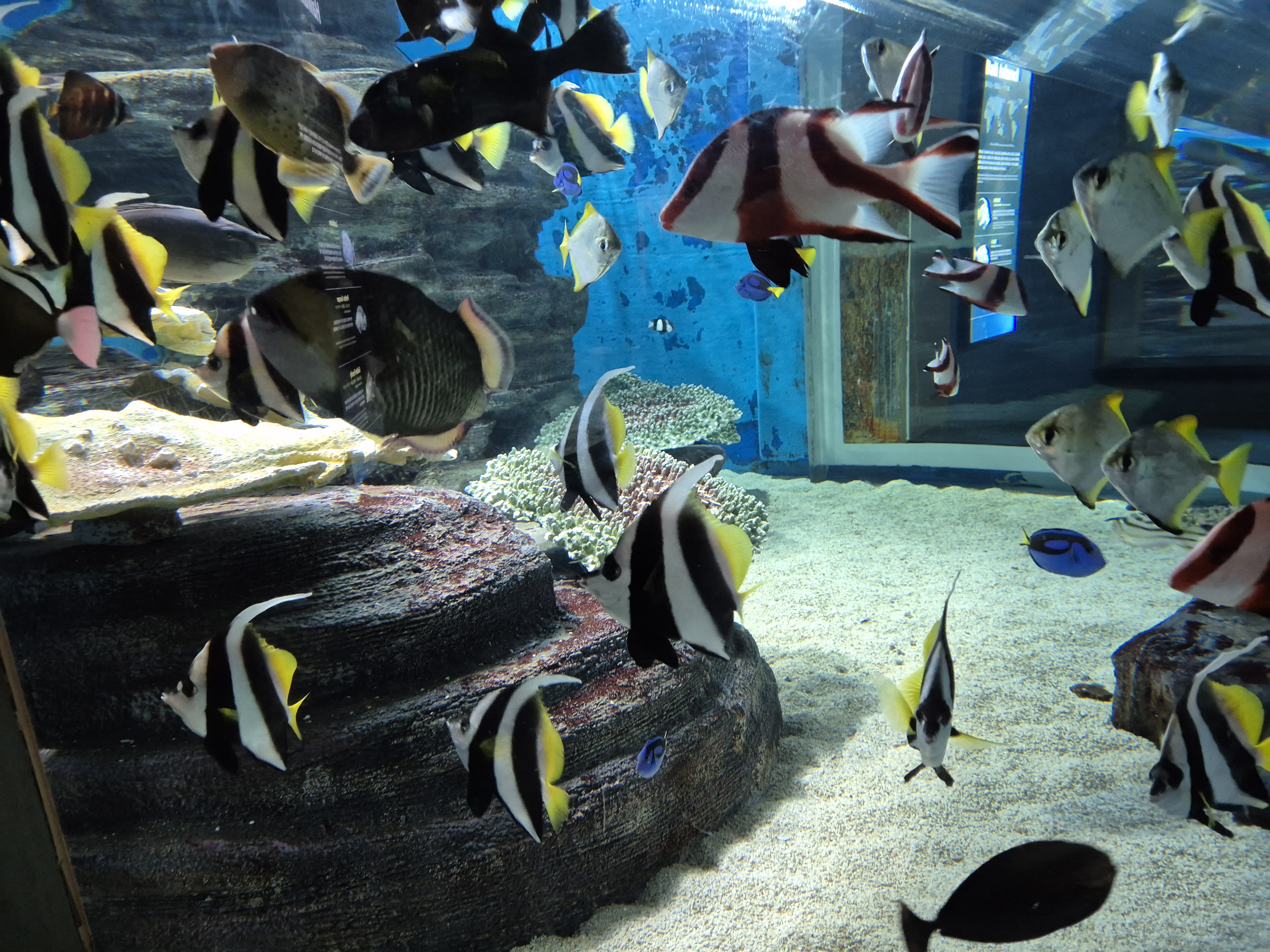 가지각색의 물고기들이 수조에서 자유롭게 헤엄을 친다.