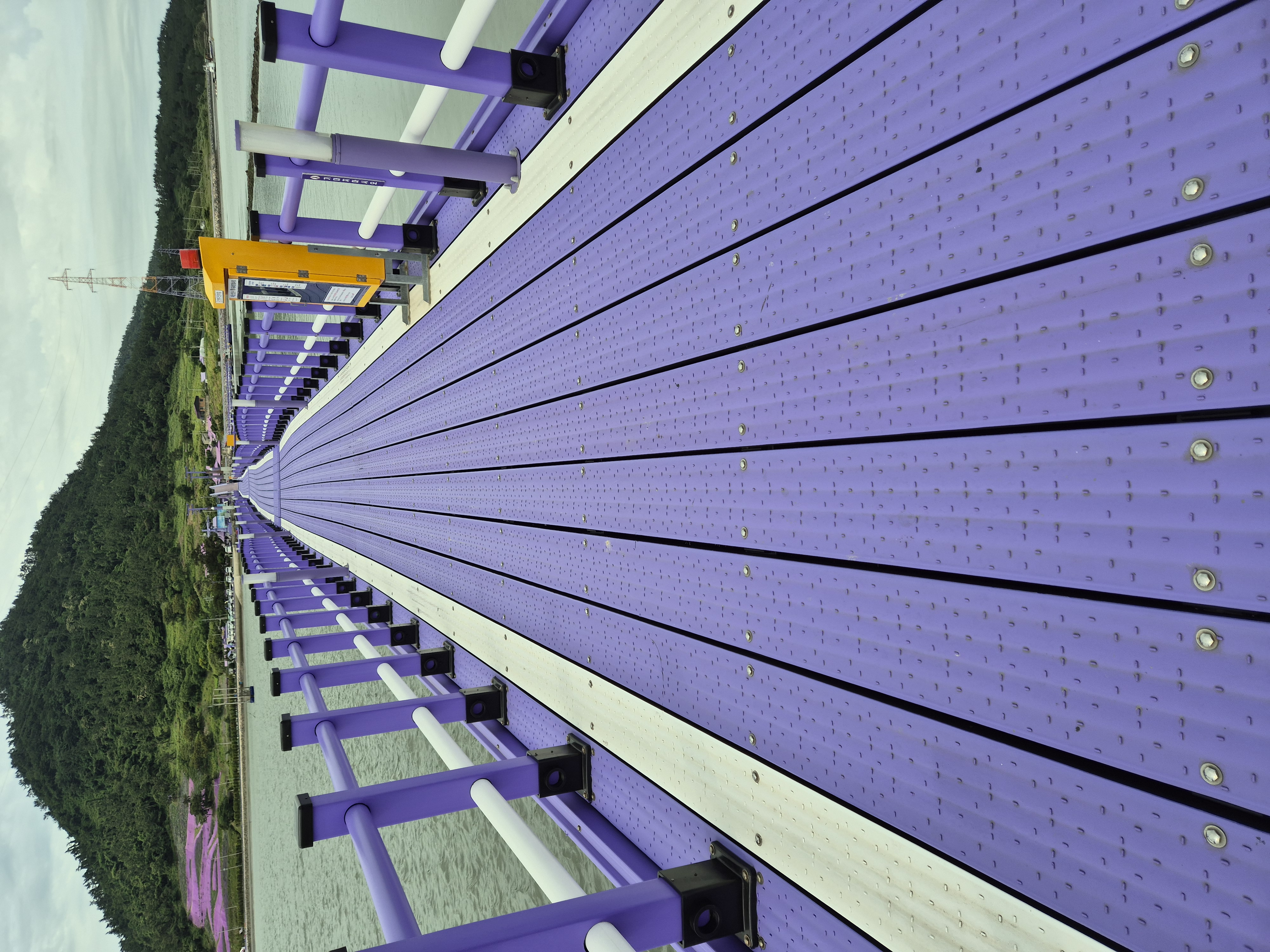 보라색 교각을 따라서 건너간다.