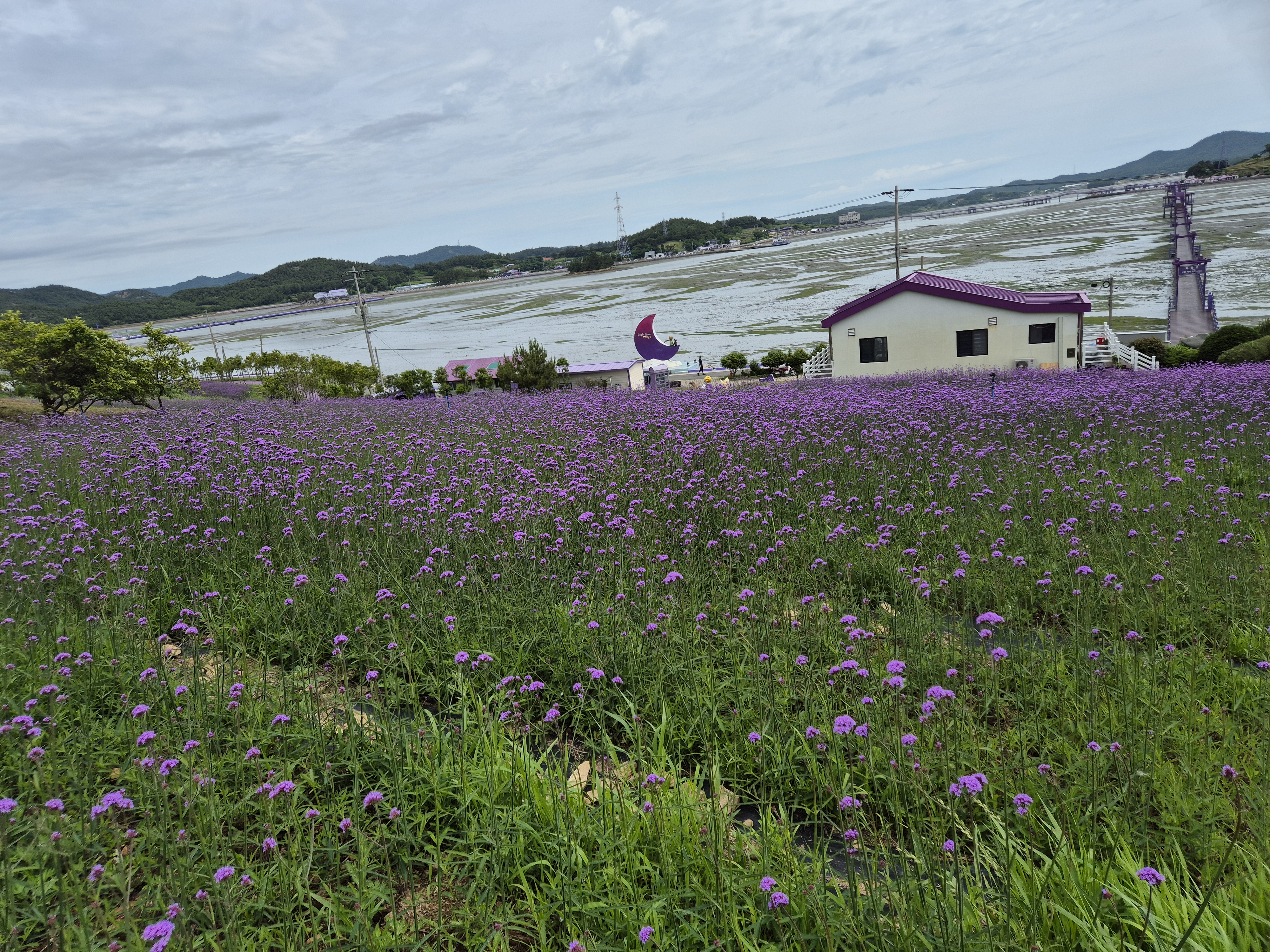 보라색 카페와 바다물이 빠진 뻘도 잘 어우린다.